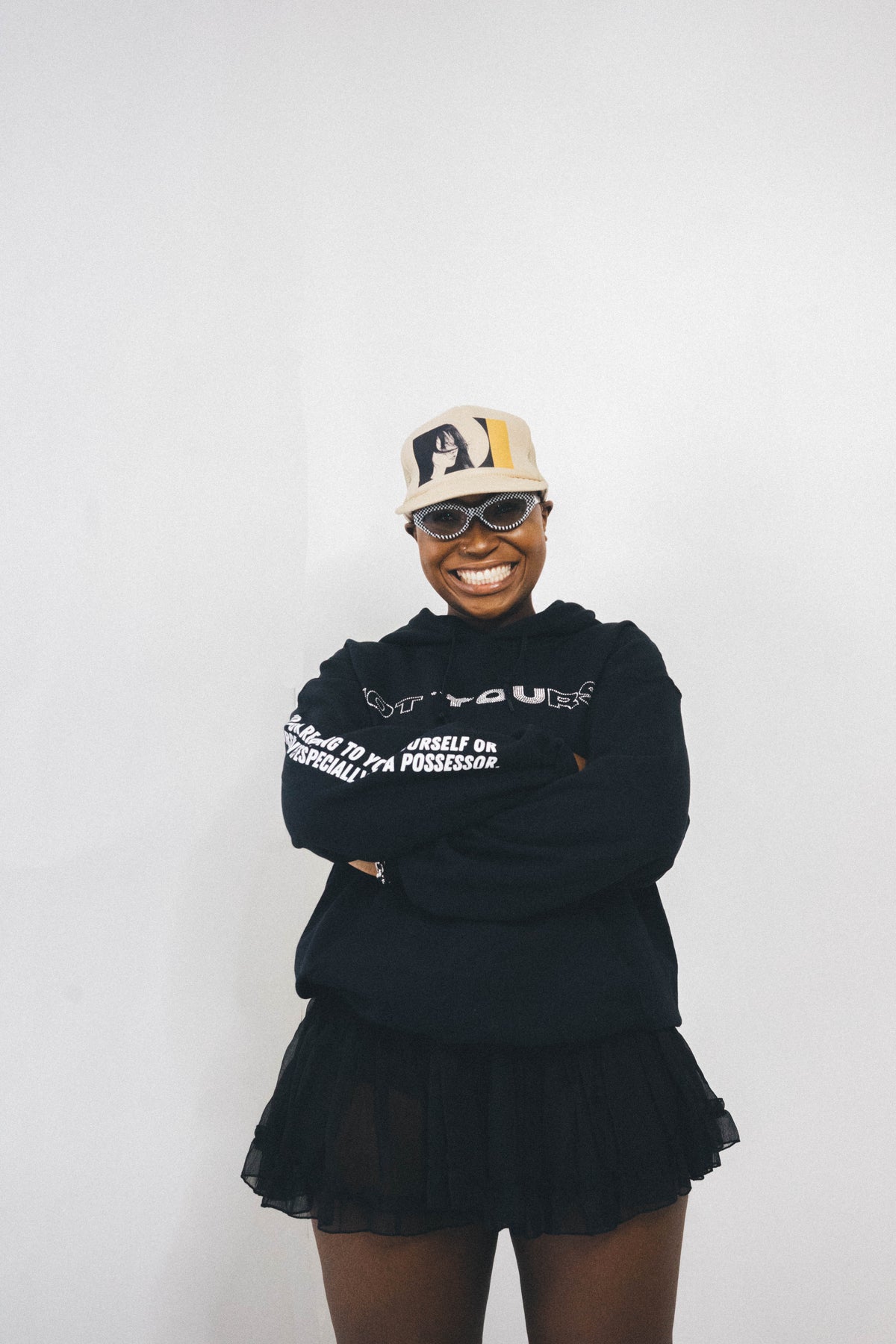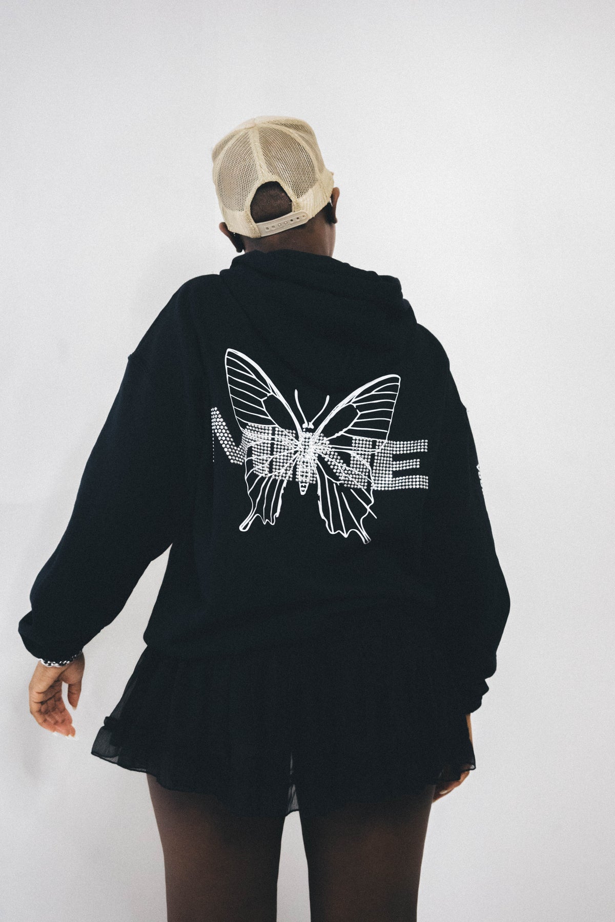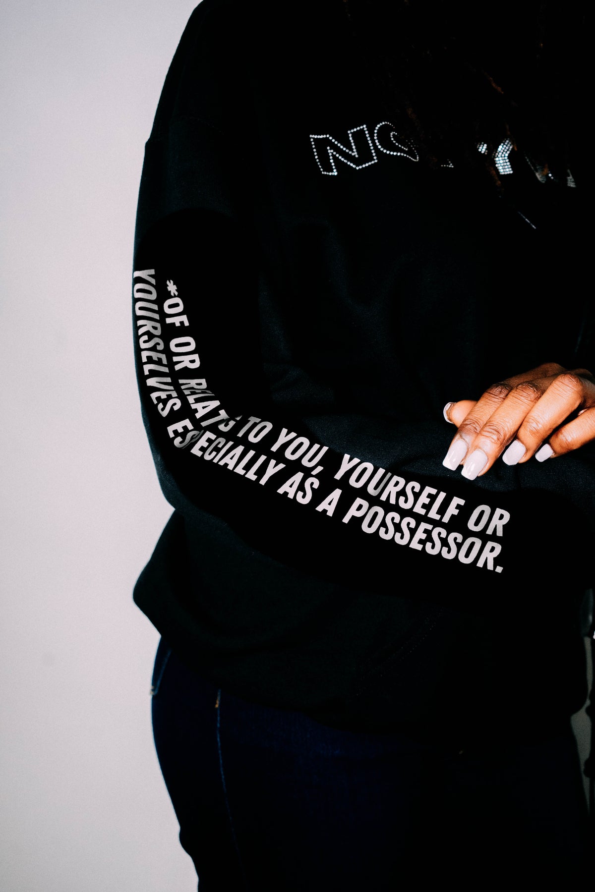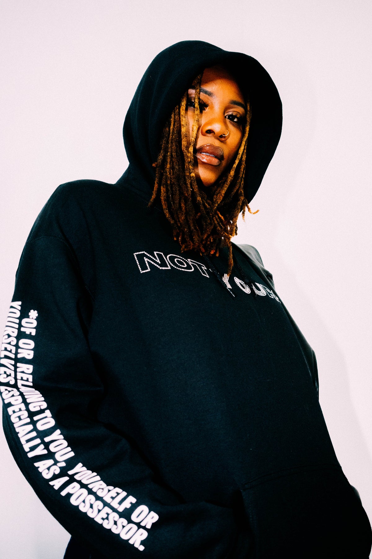 Black Hoodie with Rhinestud NOT YOU|NOT YOURS detailing on front. Back features MINE logo across a large butterfly. Right sleeve features definition of you in white: "of or relating to you yourself or yourselves especially as a possessor."